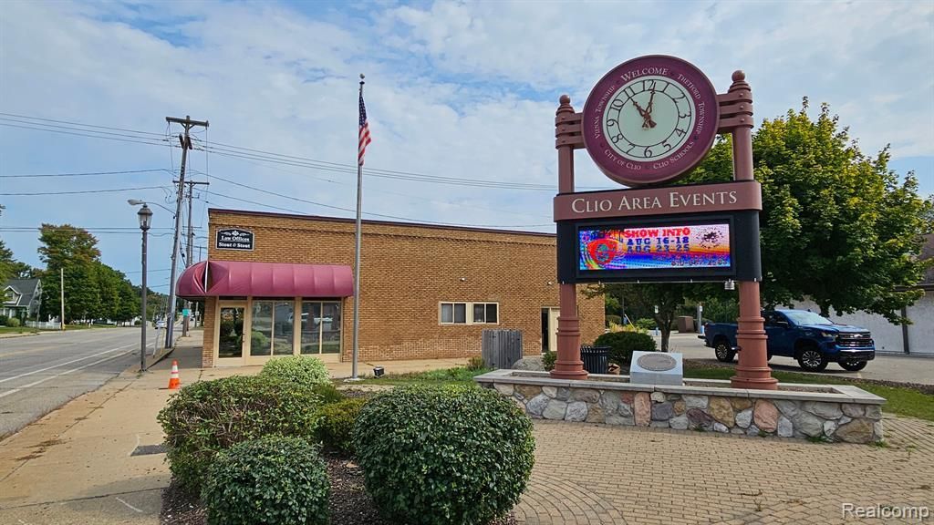 Calling all Investors and Business Owners! PRIME LOCATION in DOWNTOWN CLIO available now! 2512 sq ft Brick Office Building on the corner of Mill St and Vienna St in downtown Clio. There are 4 entrances, so you could run 1 large business or up to 4 smaller businesses, with 2 separate water meters and 4 consumers bills, rent out all the spaces. It has been a Law office for the last 70 years and a Soda Shop in the past. The North side of the building is currently divided into a Reception area, Library, 4 offices, and 2- 1/2 baths, while the South side has a Reception area, 4 offices, 1/2 bath, kitchen and open area. There is also a full basement with tons of storage, 5 brand-new custom-fitted windows ready to be installed and a paved parking area to the North side of the building. New Roof and new A/C. Come see it today and see the possibilities for yourself.