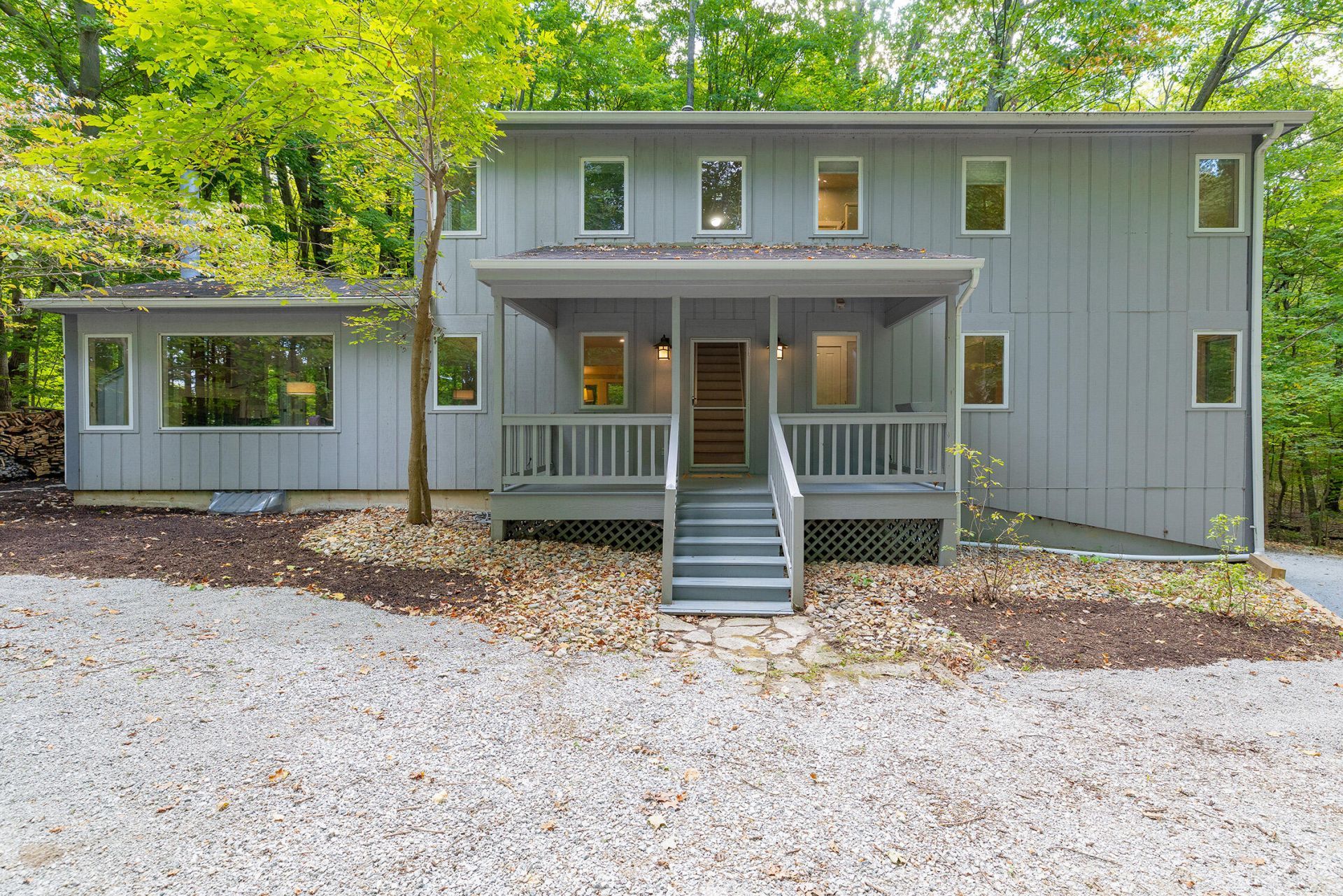 Do not miss the Wheeler- Kearnes contemporary home in the sought-after gated community of Camp Madron. This property offers a bright, open floor plan with vaulted ceilings and a dramatic wall of windows overlooking the surrounding forest. The newly updated kitchen features quality finishes and opens to a spacious living area with a cozy fireplace--perfect for gatherings year-round. Step outside to a large new deck and stone firepit, ideal for relaxing or entertaining. Recent updates include fresh landscaping that enhances the homes wooded setting. Camp Madron offers 260 acres of preserved beech-maple forest, a 60-acre spring-fed lake with a private beach, trails for hiking and cross-country skiing, and community gardens and events. Enjoy privacy, serenity, and easy access to nearby wineries, shops, and dining--just 90 minutes from Chicago. House in being sold with furnishings except for art.