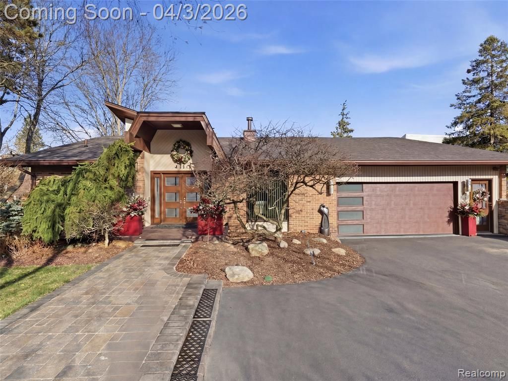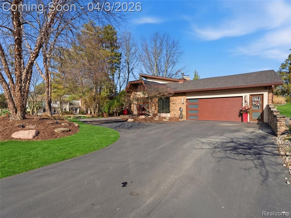 Nestled in the highly desirable Walnut Lake Hills subdivision, this distinctive contemporary quad-level home offers access to a private beach, park, gazebo, and boat docking (by rotation) on all-sports Walnut Lake—just a short walk away. Featuring one-of-a-kind architecture, the home showcases soaring ceilings, an open floor plan, and expansive windows that flood the interior with natural light. The flexible layout includes a formal dining room, den, and a dramatic great room anchored by a striking stone fireplace with built-in features. The bright white kitchen combines style and function with granite countertops (2022), an artistic china backsplash, stainless steel appliances (2022), and a wine cooler (2022). The entire upper level is dedicated to a luxurious primary suite retreat, complete with a massive closet, dressing area, and a beautifully remodeled bath (2023) featuring a tub, shower, and private balcony. One level below, a private three-bedroom wing with a full bath offers ideal separation for family or guests. The finished walk-out lower level expands the living space with a family room, full bath, bar area, cedar closet, and abundant storage. Additional fireplaces installed in 2023 enhance the ambiance in the primary bedroom, den, and lower level. This home has seen extensive updates, including interior and exterior painting (2022), new roof and gutters (2023), two furnaces and two air conditioning units (2023), carpet throughout (2023), vinyl basement flooring (2023), and a stunning front entry with travertine marble flooring (2024). Outdoor improvements include a new walkway and back patio (2024), updated landscaping with lighting (2024), and a freshly blacktopped driveway (2025). Situated on a quiet cul-de-sac, this property offers incredible potential—blending major mechanical and aesthetic updates with the opportunity to further personalize and elevate its unique design. Located within the highly acclaimed Bloomfield Hills School District, this is a rare opportunity to own a truly special
